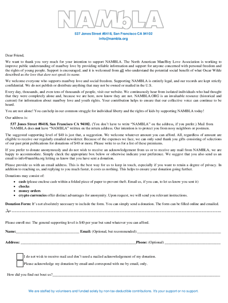 537 Jones Street #8418, San Francisco CA 94102info@nambla.orgDear Friend, We want to thank you very much for your intention to support NAM BLA. The North American Man/Boy Love Association is working