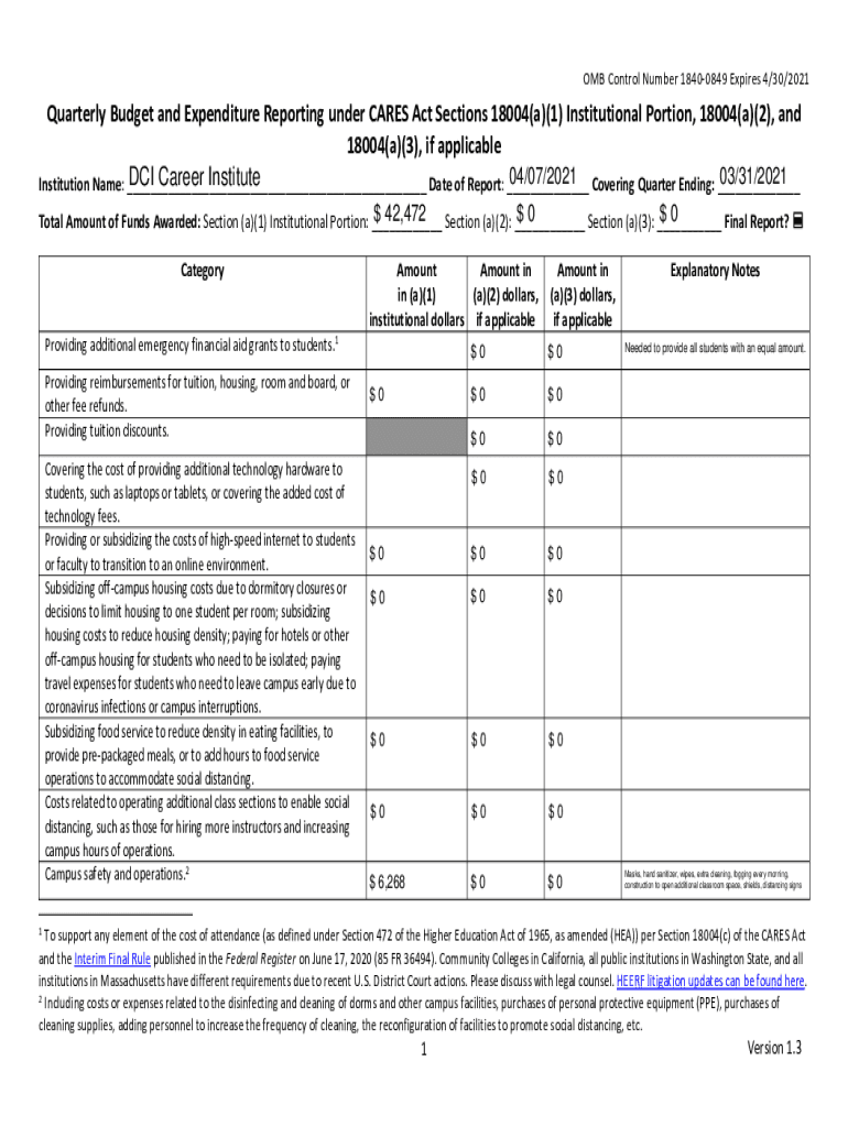 OMBControlNumber18400849Expires4/30/2021 QuarterlyBudgetandExpenditureReportingunderCARESActSections18004(a)(1)Institutionalization,18004(a)(2), and 18004(a)(3), inapplicable 04/07/2021 03/31/2021