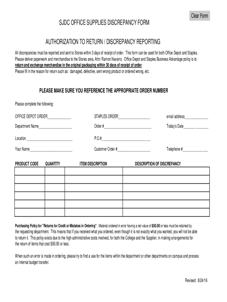 Clear Formed OFFICE SUPPLIES DISCREPANCY FORM AUTHORIZATION TO RETURN / DISCREPANCY REPORTING All discrepancies must be reported and sent to Stores within 3 days of receipt of order. This form can