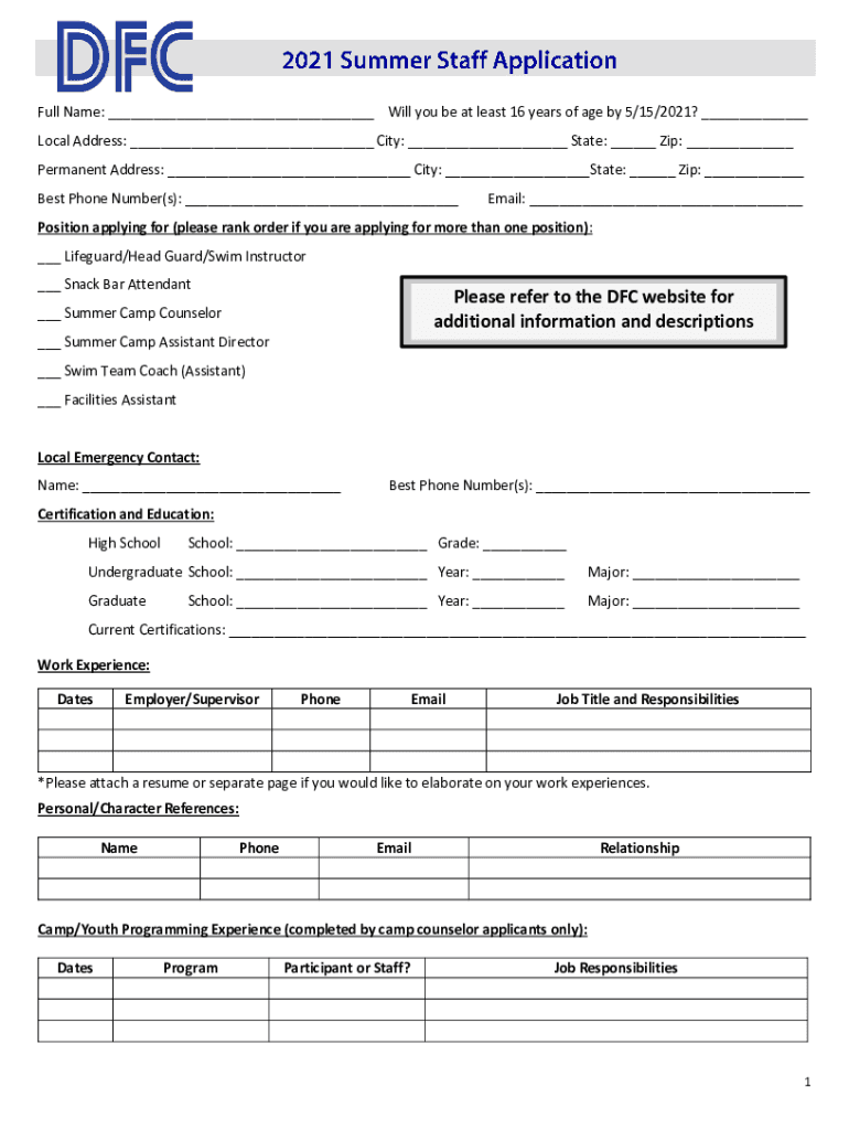 Full Name: Will you be at least 16 years of age by 5/15/2021? Local Address: City: State: Zip: Permanent Address: City: State: Zip: Best Phone Number(s): Email: Position applying for (please rank
