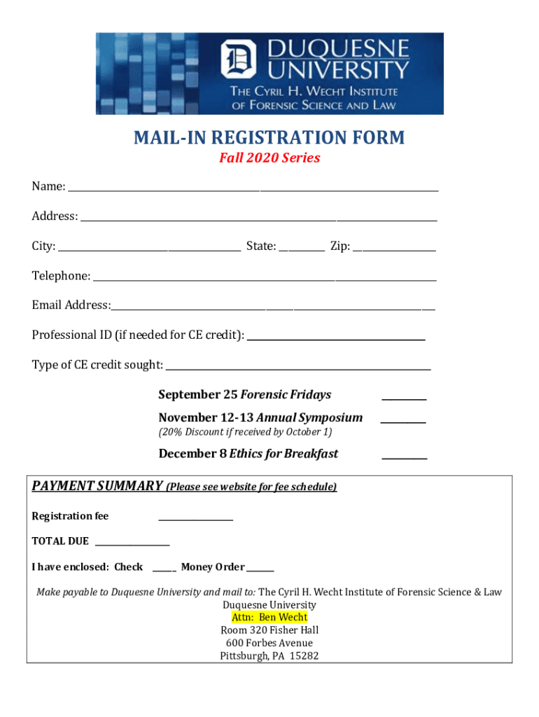 MAILING REGISTRATION FORM Fall 2020 Suriname: Address: City: State: Zip: Telephone: Email Address: Professional ID (if needed for CE credit): Type of CE credit sought: September 25 Forensic Fridays