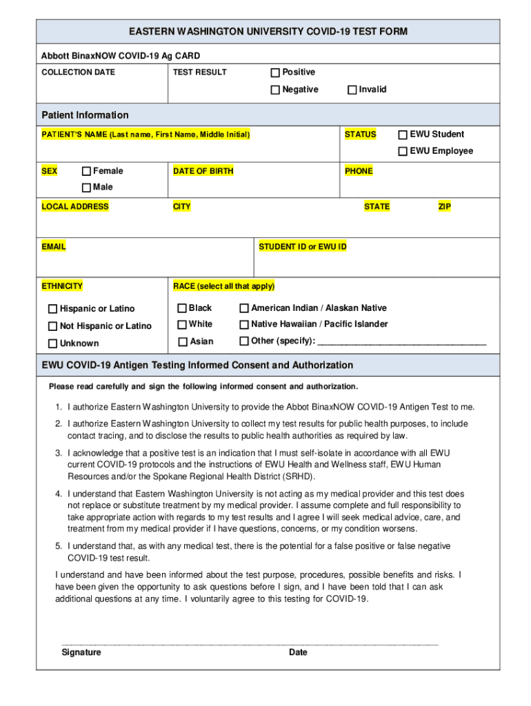 EASTERN WASHINGTON UNIVERSITY COVID-19 TEST FORM Abbott Minnow COVID-19 Ag CARD COLLECTION DATE Positiveness RESULT Negative Invalidating Information PATIENTS NAME (Last name, First Name, Middle Initial)STATUS