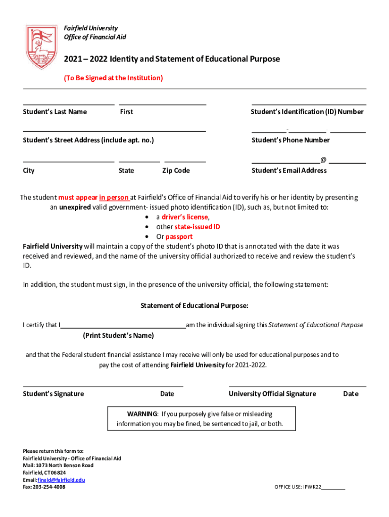 Fairfield University Office of Financial Aid2021 2022 Identity and Statement of Educational Purpose (To Be Signed at the Institution)Students Last NameFirstStudents Identification (ID) NumberStudents