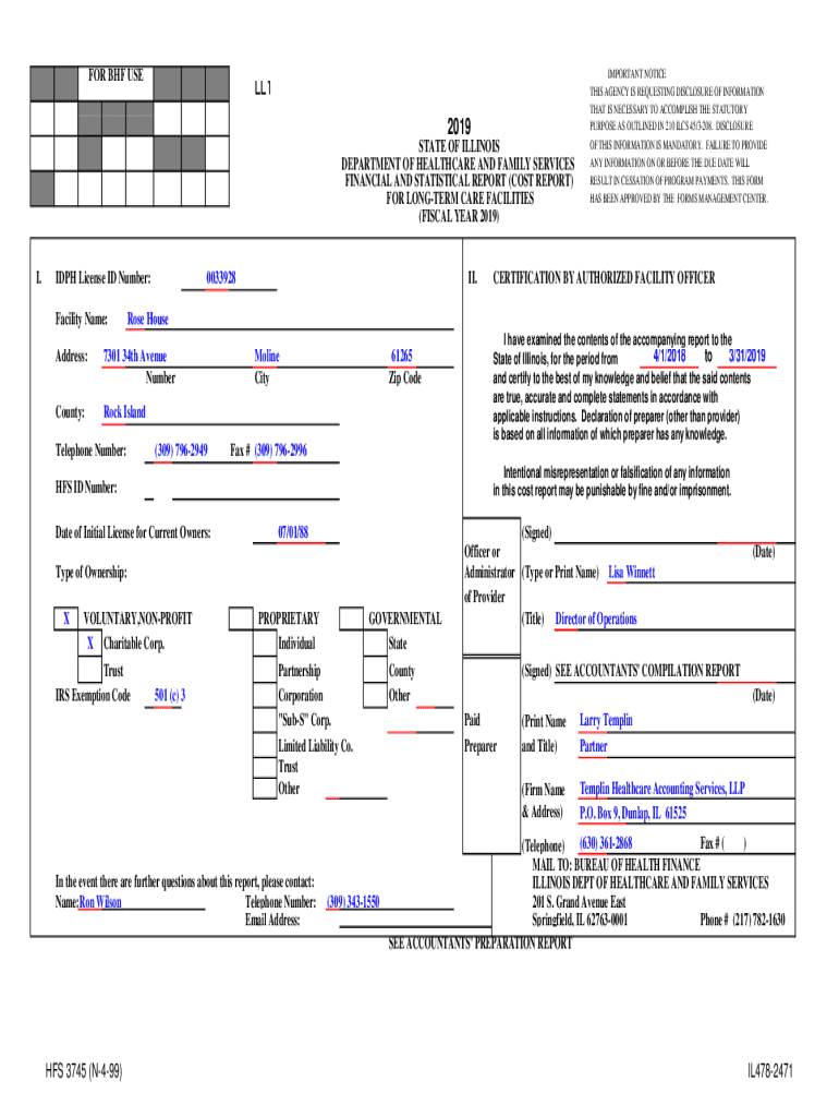FOR BHF USELL1 2019STATE OF ILLINOIS DEPARTMENT OF HEALTHCARE AND FAMILY SERVICES FINANCIAL AND STATISTICAL REPORT (COST REPORT) FOR LONGER CARE FACILITIES (FISCAL YEAR 2019) I.DPH License ID Number: