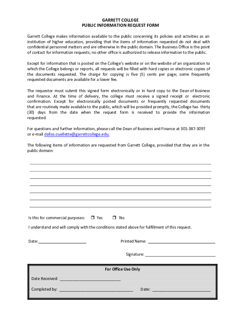 GARRETT COLLEGE PUBLIC INFORMATION REQUEST FORM Garrett College makes information available to the public concerning its policies and activities as an institution of higher education, providing that