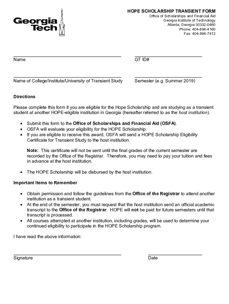 HOPE SCHOLARSHIP TRANSIENT FORMOffice of Scholarships and Financial Aid Georgia Institute of Technology Atlanta, Georgia 303320460 Phone: 4048944160 Fax: 4048947412NameGT ID#Name of College/Institute/University