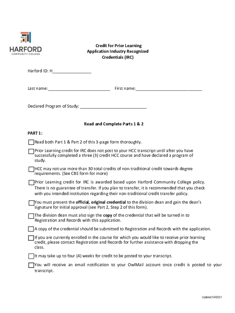 Credit for Prior Learning Application Industry Recognized Credentials (IRC) Hartford ID: H Last name: First name: Declared Program of Study: Read and Complete Parts 1 & 2 PART 1: Read both Part 1