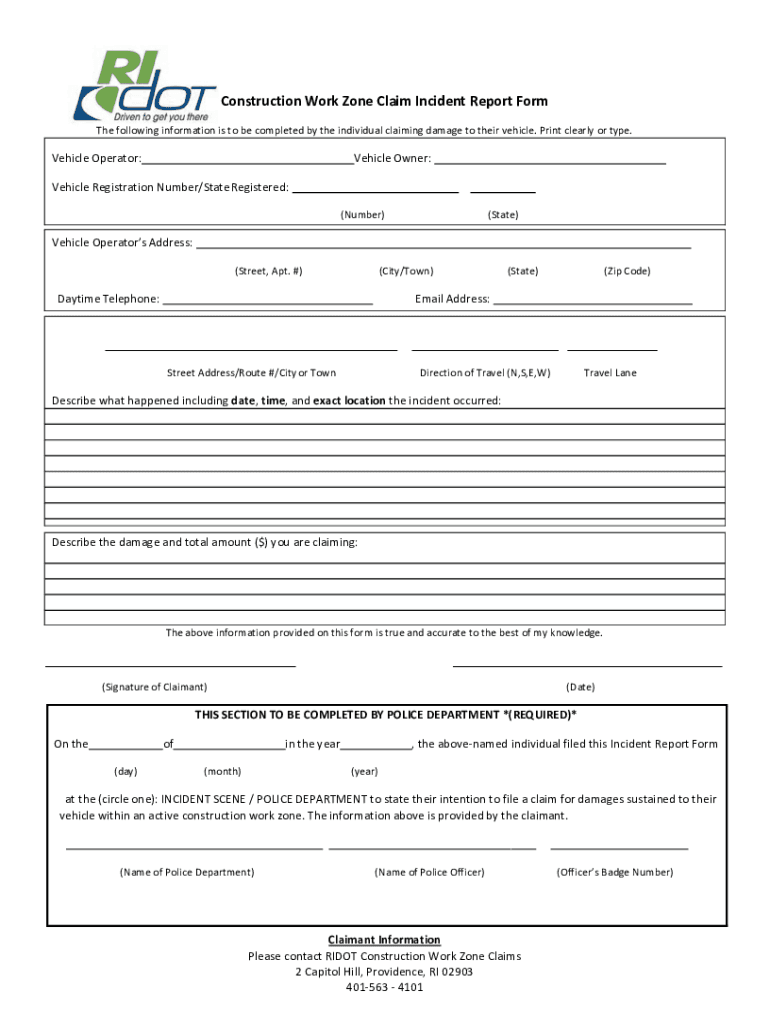 Construction Work Zone Claim Incident Report Form The following information is to be completed by the individual claiming damage to their vehicle. Print clearly or type. Vehicle Operator:Vehicle Owner:Vehicle