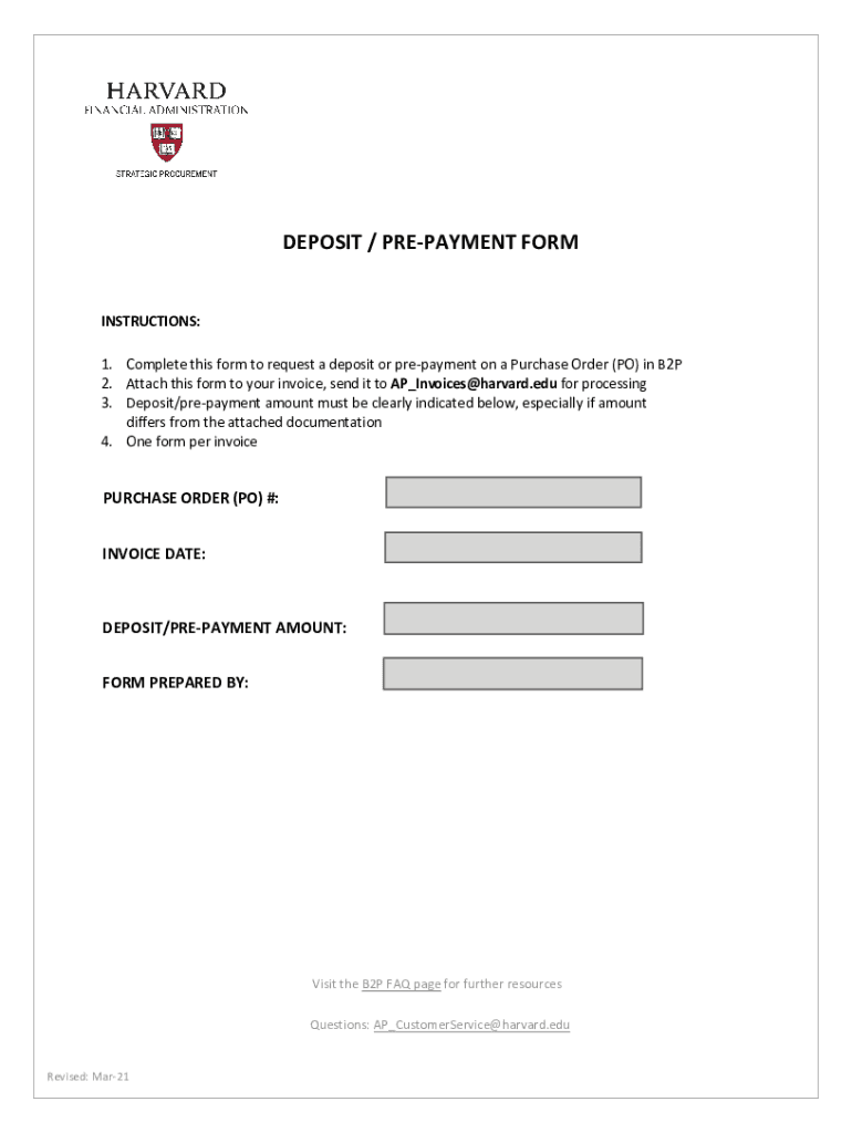 DEPOSIT / PREPAYMENT FORM INSTRUCTIONS: 1. Complete this form to request a deposit or prepayment on a Purchase Order (PO) in B2P 2. Attach this form to your invoice, send it to AP_Invoices@harvard.edu