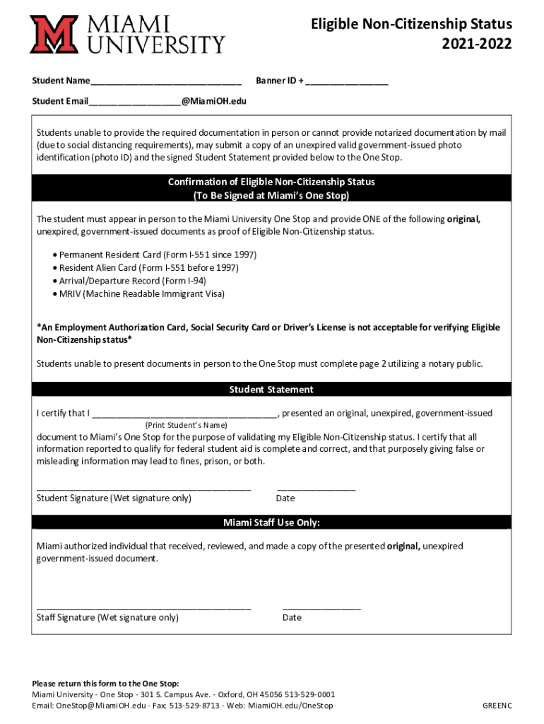 Eligible Citizenship Status 20212022 Student Name Banner ID + Student Email Miami OH.edu Students unable to provide the required documentation in person or cannot provide notarized documentation by