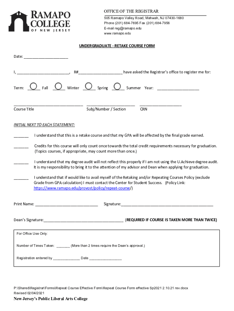 OFFICE OF THE REGISTRAR 505 Ramp Valley Road, Yahweh, NJ 074301680 Phone (201) 6847695 Fax (201) 6847956 Email reg ramp.edu www.ramapo.edu UNDERGRADUATERETAKECOURSEFORM Date: I, R# haveaskedtheRegistrarsofficetoregistermefor: