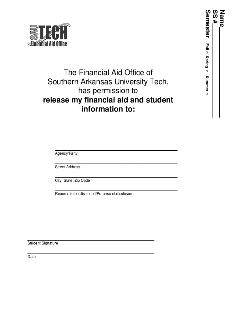 Agency/Party Street Address City, State, Zip Code Records to be disclosed/Purpose of disclosure Student Signature Database SS # Semester Fall Spring Summer The Financial Aid Office of Southern Arkansas