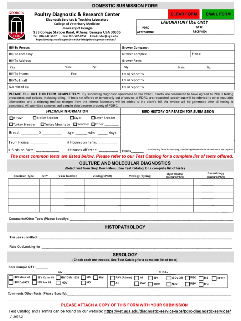 DOMESTIC SUBMISSION Formulary Diagnostic & Research CenterCLEAR FORMDiagnostic Services & Teaching Laboratory College of Veterinary Medicine University of GeorgiaLABORATORY USE OnlyFans: 7065420252DATE