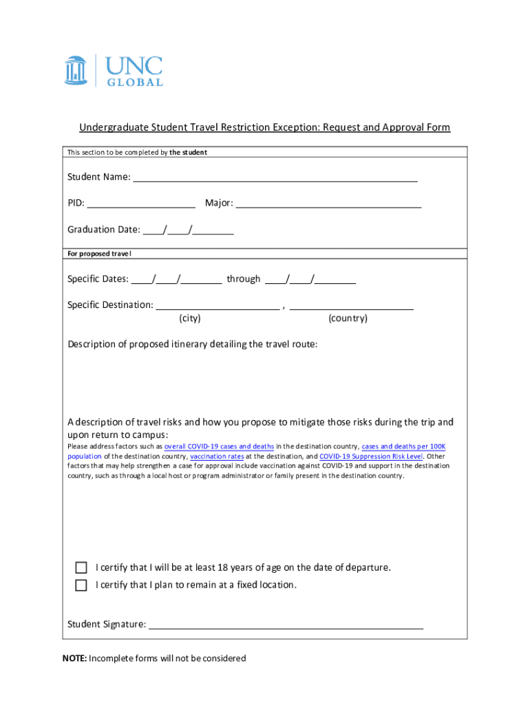 Undergraduate Student Travel Restriction Exception: Request and Approval Form This section to be completed by the studentStudent Name: PID: Major: Graduation Date: / / For proposed travelSpecific