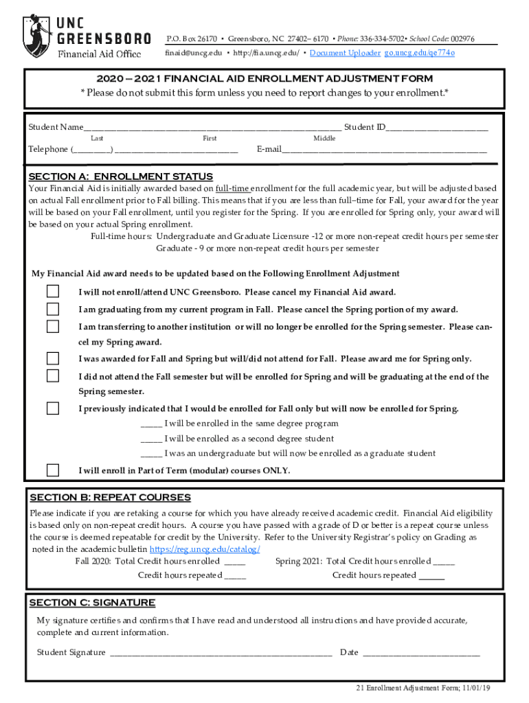 P.O. Box 26170 Greensboro, NC 27402 6170 Phone: 3363345702 School Code: 002976 fin aid UNC.edu http://fia.uncg.edu/ Document Uploader go.uncg.edu/qe774o2020 2021 FINANCIAL AID ENROLLMENT ADJUSTMENT