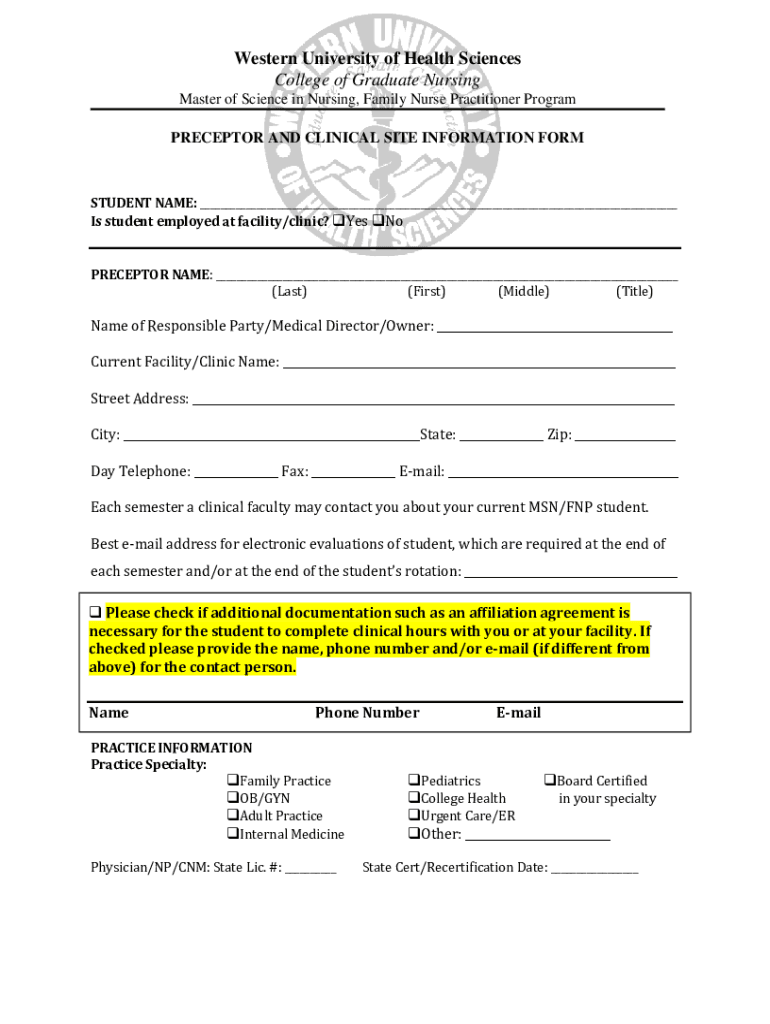 Western University of Health Sciences College of Graduate Nursing Master of Science in Nursing, Family Nurse Practitioner ProgramPRECEPTOR AND CLINICAL SITE INFORMATION FORMSTUDENT NAME: Is student