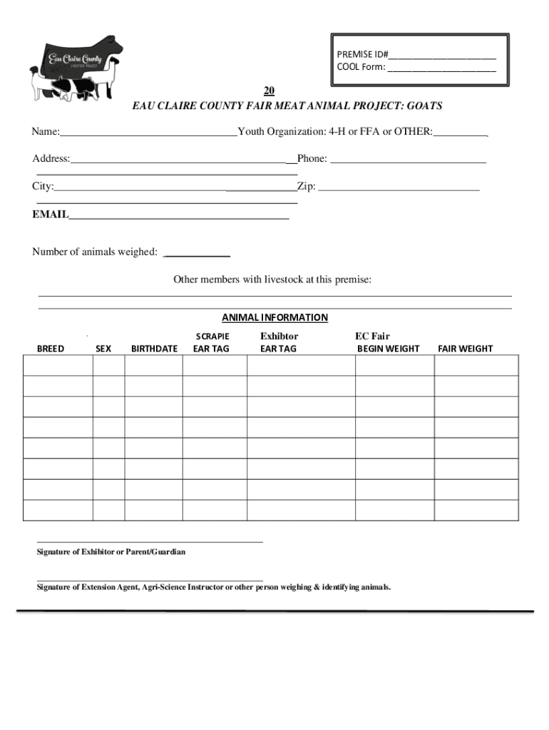 PREMISE ID# COOL Form: 20 EAU CLAIRE COUNTY FAIR MEAT ANIMAL PROJECT: GOATS Name: Youth Organization: 4H or FFA or OTHER: Address: Phone: City: Zip: EMAIL Number of animals weighed: Other members