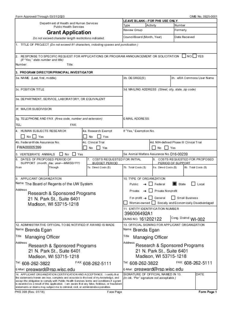 Form Approved Through 03/31/2020OMB No. 09250001 LEAVE BLANKER PHS USE ONLY. Type Activity Number Review Group FormerlyDepartment of Health and Human Services Public Health Services Grant ApplicationCouncil/Board