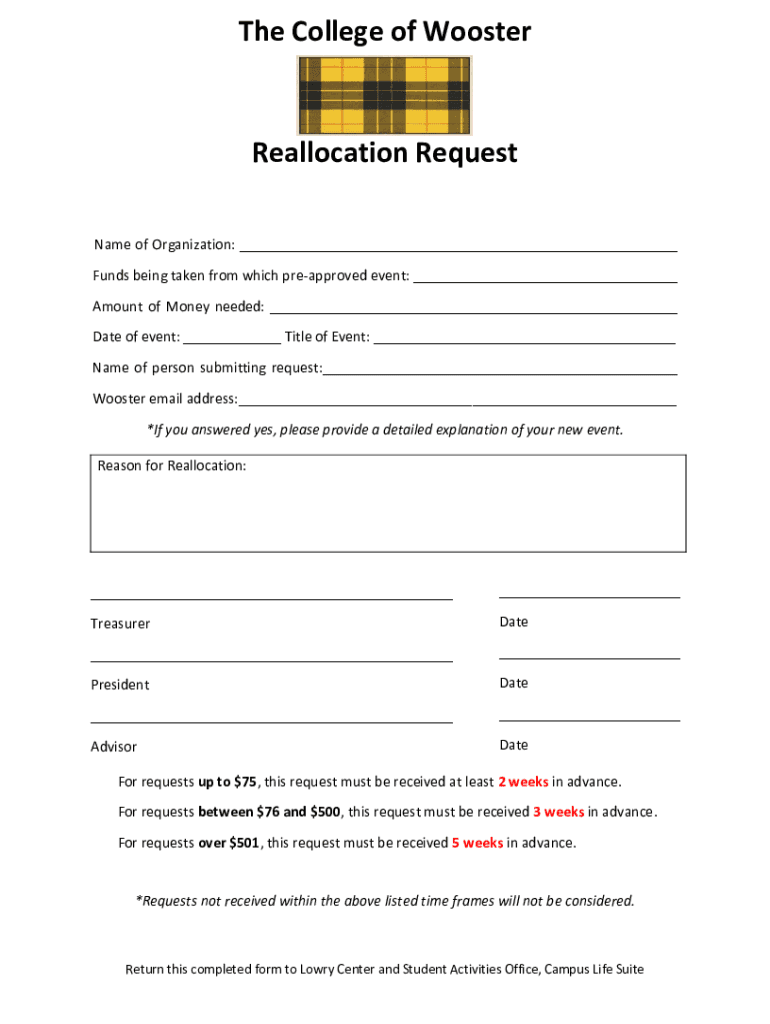 The College of Wooster Reallocation Request Name of Organization: Funds being taken from which preapproved event: Amount of Money needed: Date of event: Title of Event: Name of person submitting request: