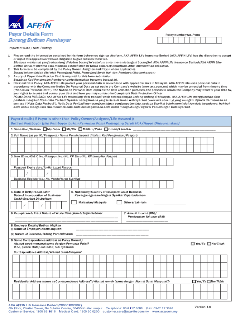 Mayor Details Formality Number/No. PolisiBorang Outran Peshawar Important Note / Not Pending:1. Please read the information contained in this form before you sign up this form. AXA AFFINE Life Insurance