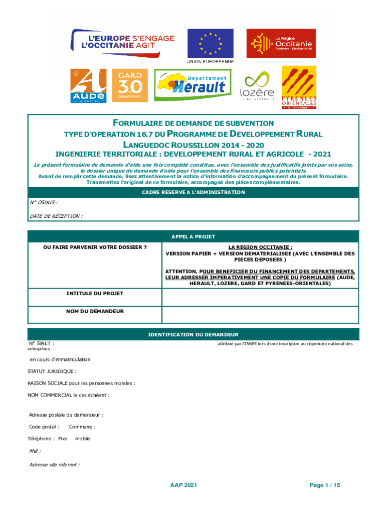 FORMULA IRE DE DEMAND DE SUBVENTION TYPE D\'OPERATION 16.7 DU Program DE DEVELOPMENT RURAL LANGUID BOUILLON 2014 2020 INGENIERIE TERRITORIAL : DEVELOPMENT RURAL ET AGRICOLA 2021 Le present formula