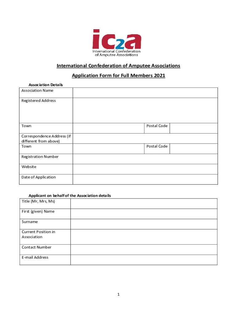 International Confederation of Amputee Associations Application Form for Full Members 2021 Association Details Association Name Registered AddressTownPostal CodeCorrespondence Address (if different