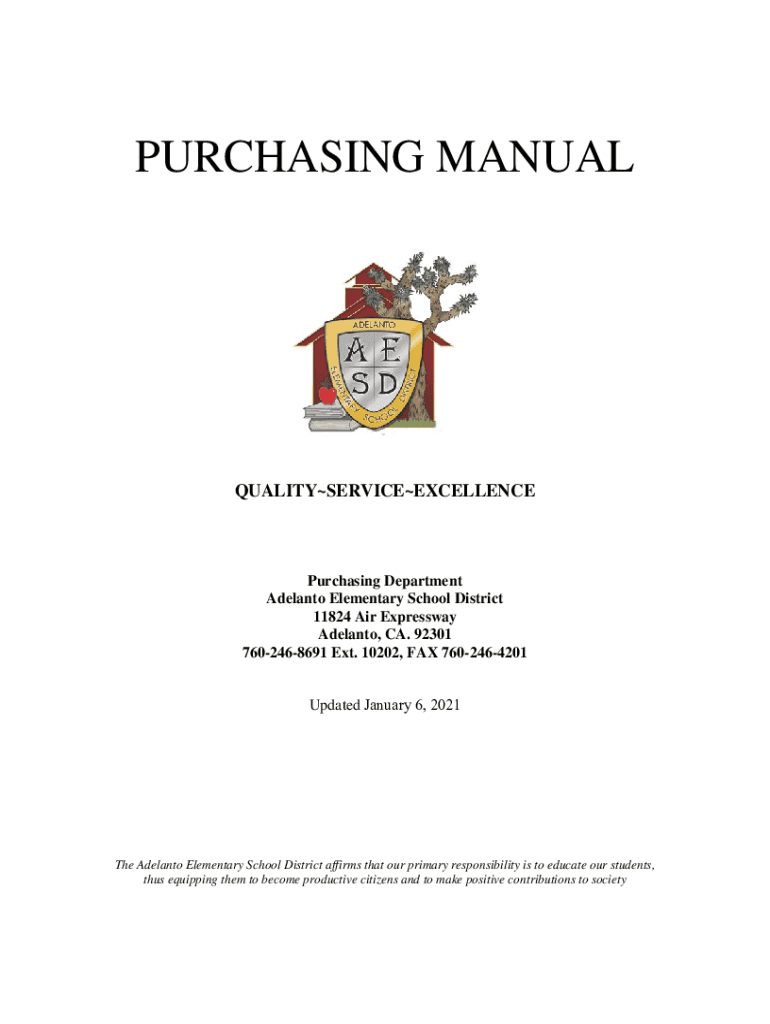 PURCHASING MANUALQUALITYSERVICEEXCELLENCEPurchasing Department Delano Elementary School District 11824 Air Expressway Delano, CA. 92301 7602468691 Ext. 10202, FAX 7602464201 Updated January 6, 2021The