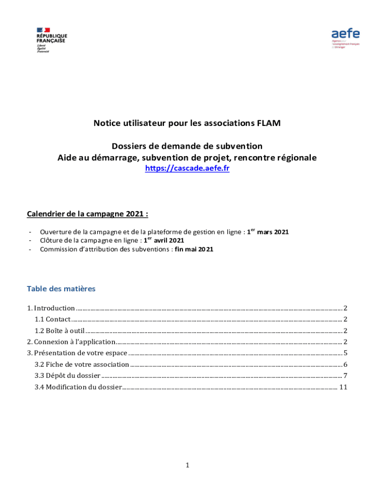 Notice utilisateur pour LES associations FLAG Dossiers DE demand DE subvention Aide AU marriage, subvention DE project, encounter regional https://cascade.aefe.frCalendrier de la champagne 2021 :