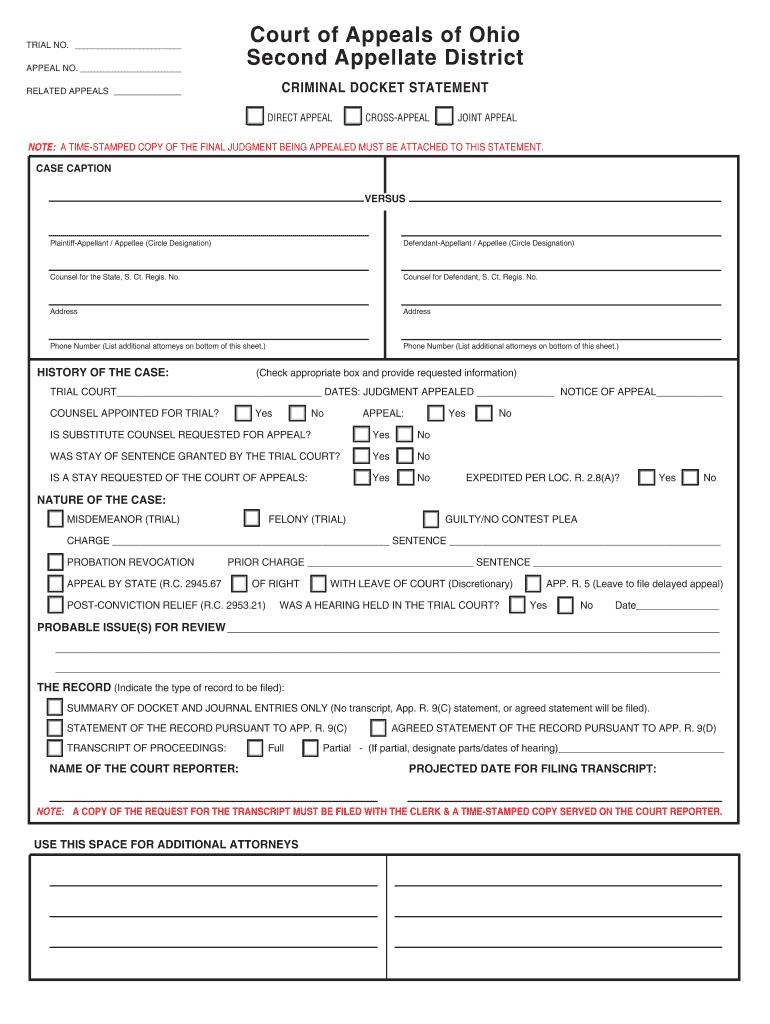 The Criminal Docket Statement is a legal form used by appellants in Ohio to file a criminal appeal in the Court of Appeals, detailing the case history and judgment being contested.