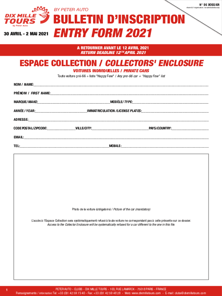 N DE DOSSIER PETER AUTO30 APRIL 2 MAI 2021rserv organization / for administration onlyBULLETIN INSCRIPTION ENTRY FORM 2021 A RETURNER SAVANT LE 12 APRIL 2021 RETURN DEADLINE 12 TH APRIL 2021ESPACE