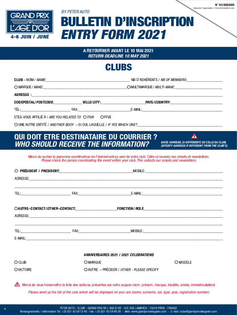 N DE DOSSIER serve organization / for administration only PETER AUTO46 JOIN / JUNEBULLETIN INSCRIPTION ENTRY FORM 2021 A RETURNER SAVANT LE 10 MAI 2021 RETURN DEADLINE 10 MAY 2021CLUBS CLUB NOT /