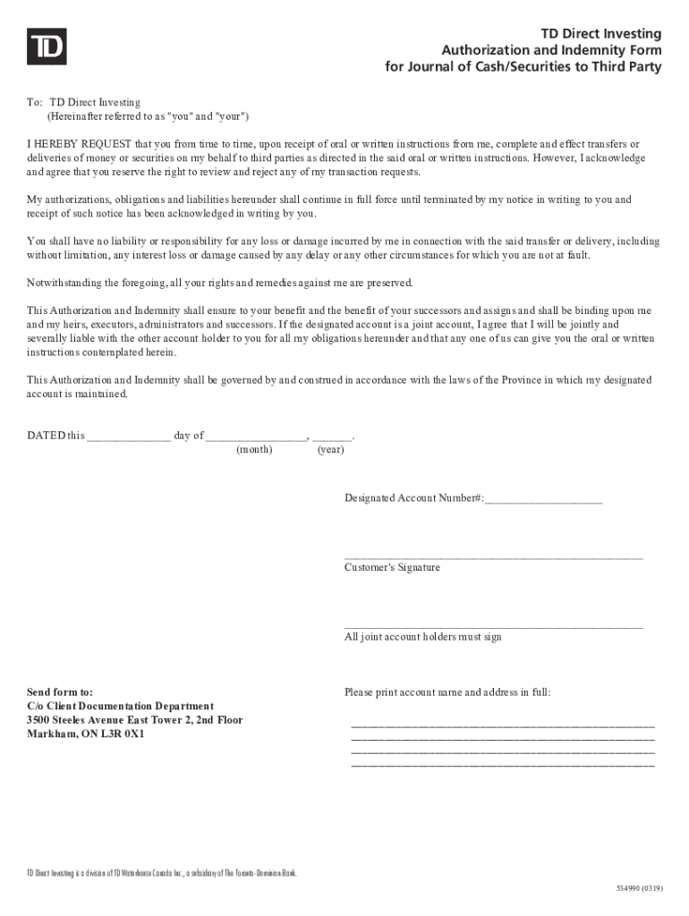 Get the free TD Direct Investing Authorization and Indemnity Form for ...