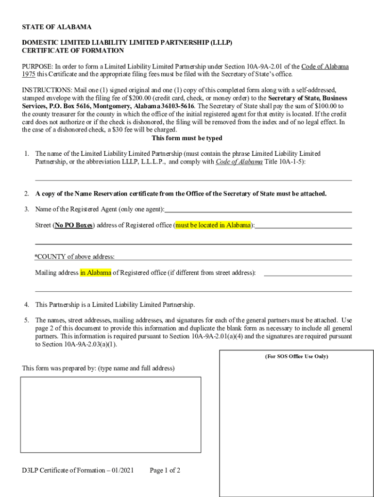STATE OF ALABAMA DOMESTIC LIMITED LIABILITY LIMITED PARTNERSHIP (LL LP) CERTIFICATE OF FORMATION PURPOSE: In order to form a Limited Liability Limited Partnership under Section 10A9A2.01 of the Code