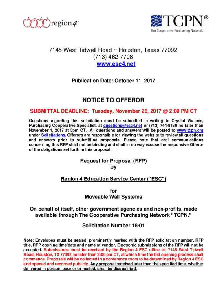 7145 West Ti dwell Road Houston, Texas 77092 (713) 4627708 www.esc4.net Publication Date: October 11, 2017NOTICE TO OFFER OR SUBMITTAL DEADLINE: Tuesday, November 28, 2017 2:00 PM CT Questions regarding