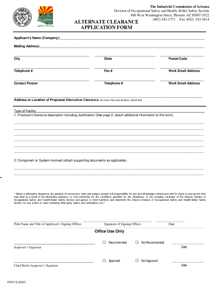 The Industrial Commission of Arizona Division of Occupational Safety and Health, Boiler Safety Section 800 West Washington Street, Phoenix AZ 850072922 (602) 5421771 Fax (602) 5421614ALTERNATE CLEARANCE