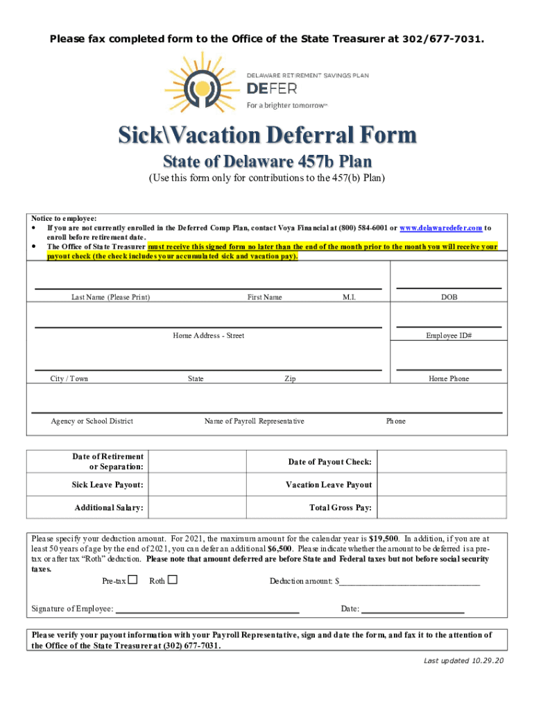 Please fax completed form to the Office of the State Treasurer at 302/6777031. SickVacation Deferral State of Delaware 457b Plan (Use this form only for contributions to the 457(b) Plan)Notice to