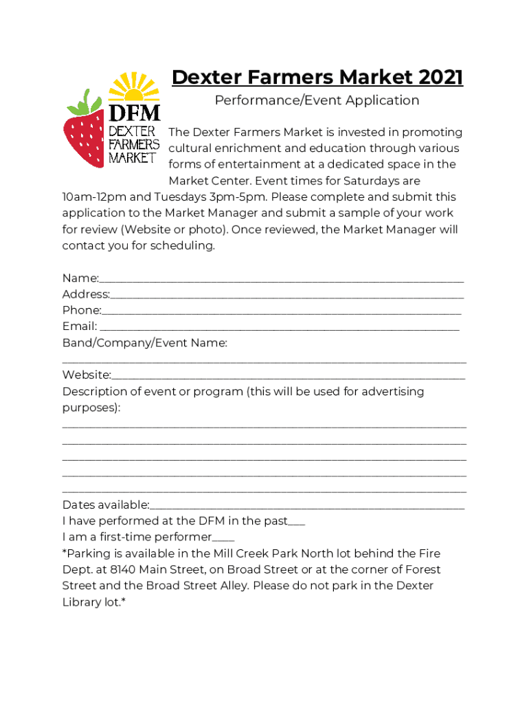 Dexter Farmers Market 2021 Performance/Event Application The Dexter Farmers Market is invested in promoting cultural enrichment and education through various forms of entertainment at a dedicated