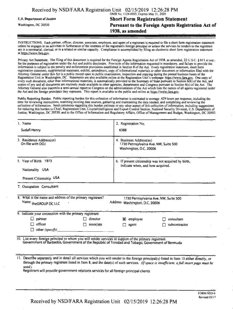 Received by NSW/FAR Registration Unit 02/15/2019 12:26:28 PM OMB No. 1124^0005; Expires May 31,2020u.s. Department of Justice Short Form Registration Statement Pursuant to the Foreign Agents Registration