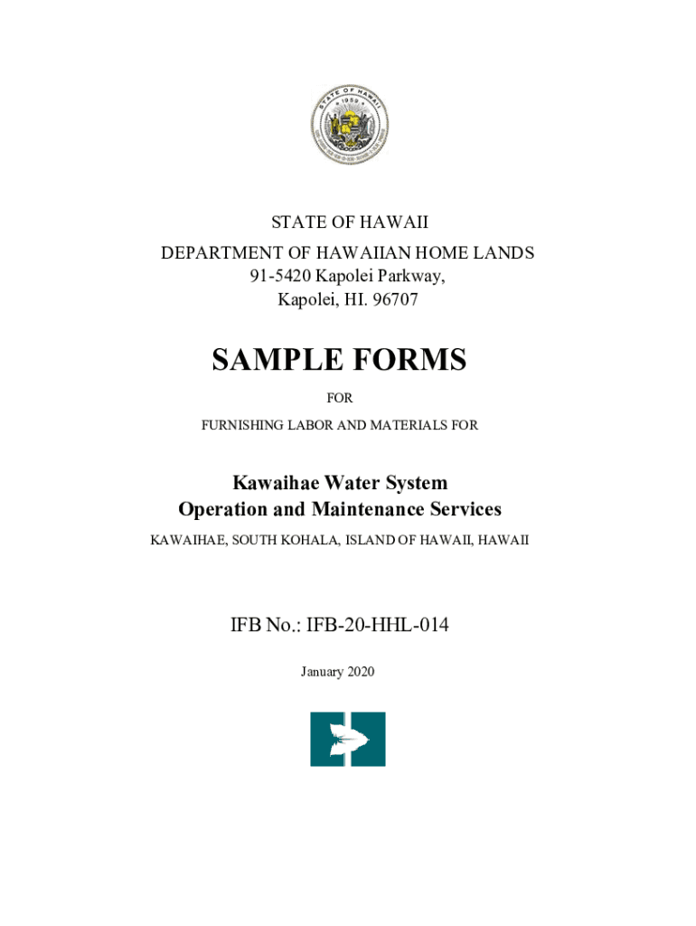 STATE OF HAWAII DEPARTMENT OF HAWAIIAN Homelands 915420 Cupola Parkway, Cupola, HI. 96707SAMPLE FORMS FOR FURNISHING LABOR AND MATERIALS FORKawaihae Water System Operation and Maintenance Services
