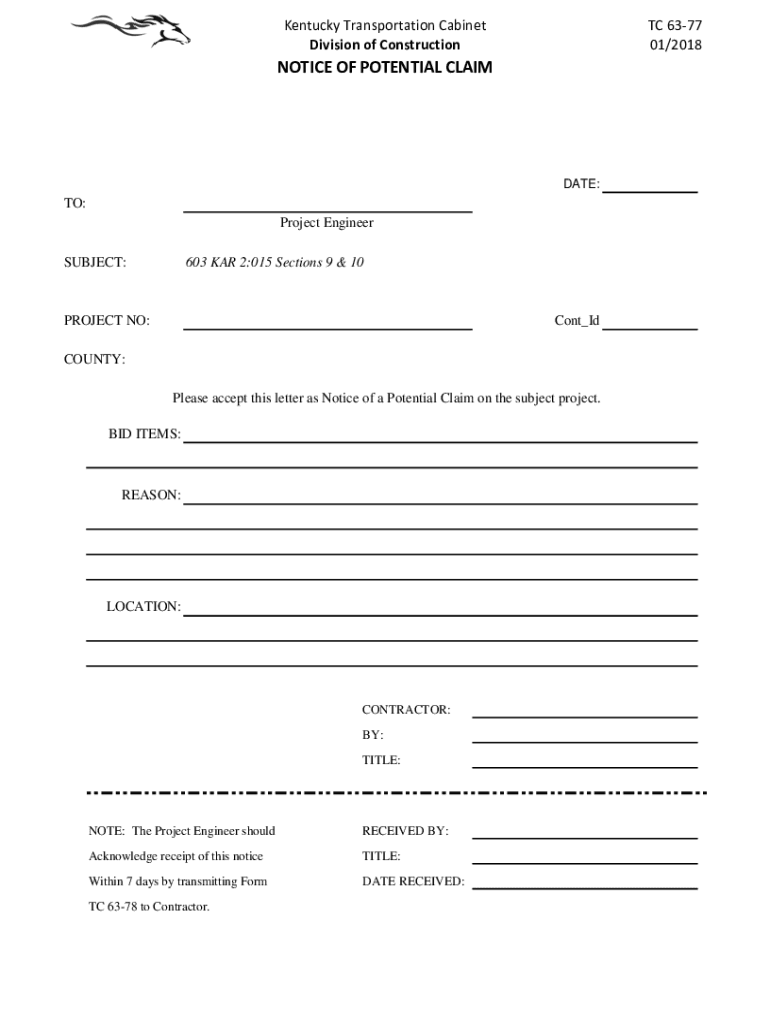 Kentucky Transportation Cabinet Division of Construction TC 6377 01/2018NOTICE OF POTENTIAL CLIMATE:TO: Project Engineer SUBJECT:603 CAR 2:015 Sections 9 & 10PROJECT NO:Cont County: Please accept