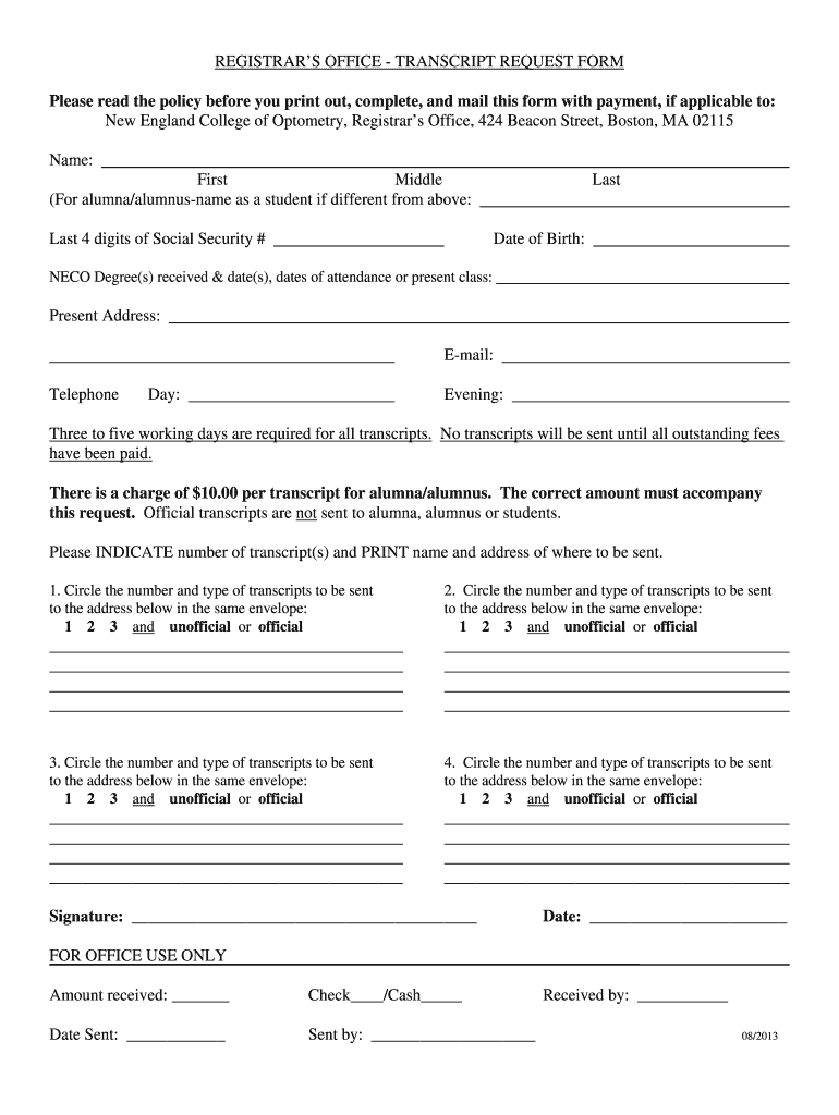 The Transcript Request Form is a document used by students and alumni of New England College of Optometry to request official or unofficial transcripts.