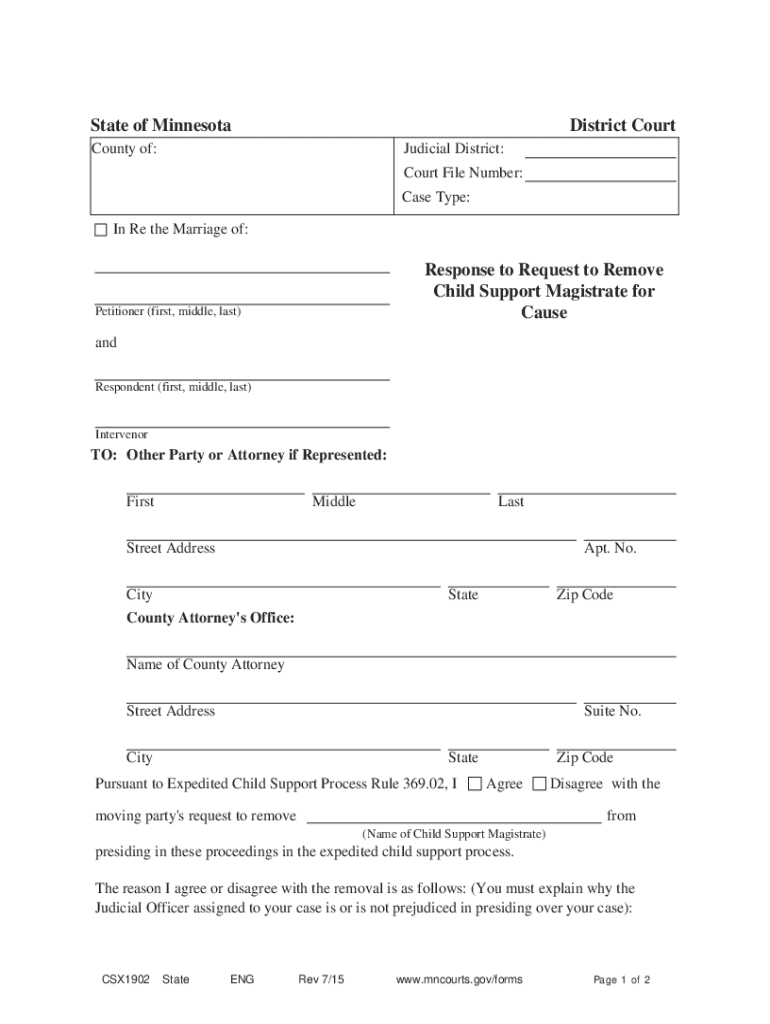 State of MinnesotaDistrict Court Judicial District:County of:Court File Number: Case Type: In Re the Marriage of:Response to Request to Remove Child Support Magistrate for CausePetitioner (first,