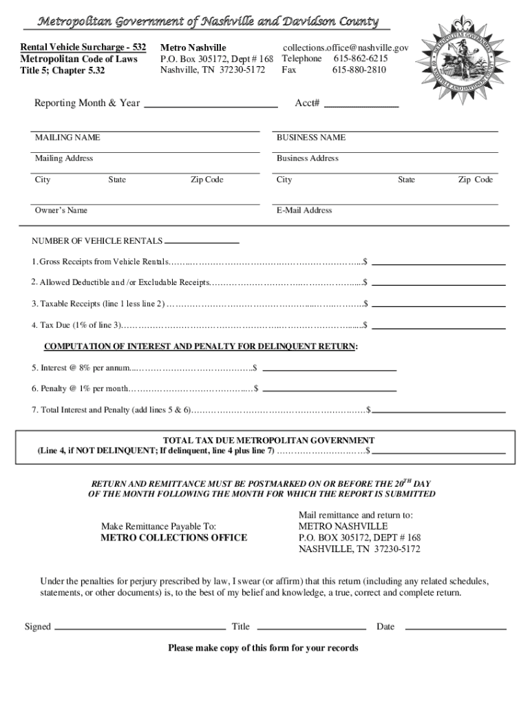 Metropolitan Government of Nashville and Davidson County Rental Vehicle Surcharge 532 Metropolitan Code of Laws Title 5; Chapter 5.32collections.office Nashville.gov Metro Nashville P.O. Box 305172,