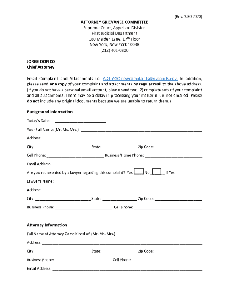 (Rev. 7.30.2020)ATTORNEY GRIEVANCE COMMITTEE Supreme Court, Appellate Division First Judicial Department 180 Maiden Lane, 17th Floor New York, New York 10038 (212) 4010800 JORGE DO PICO Chief Attorney