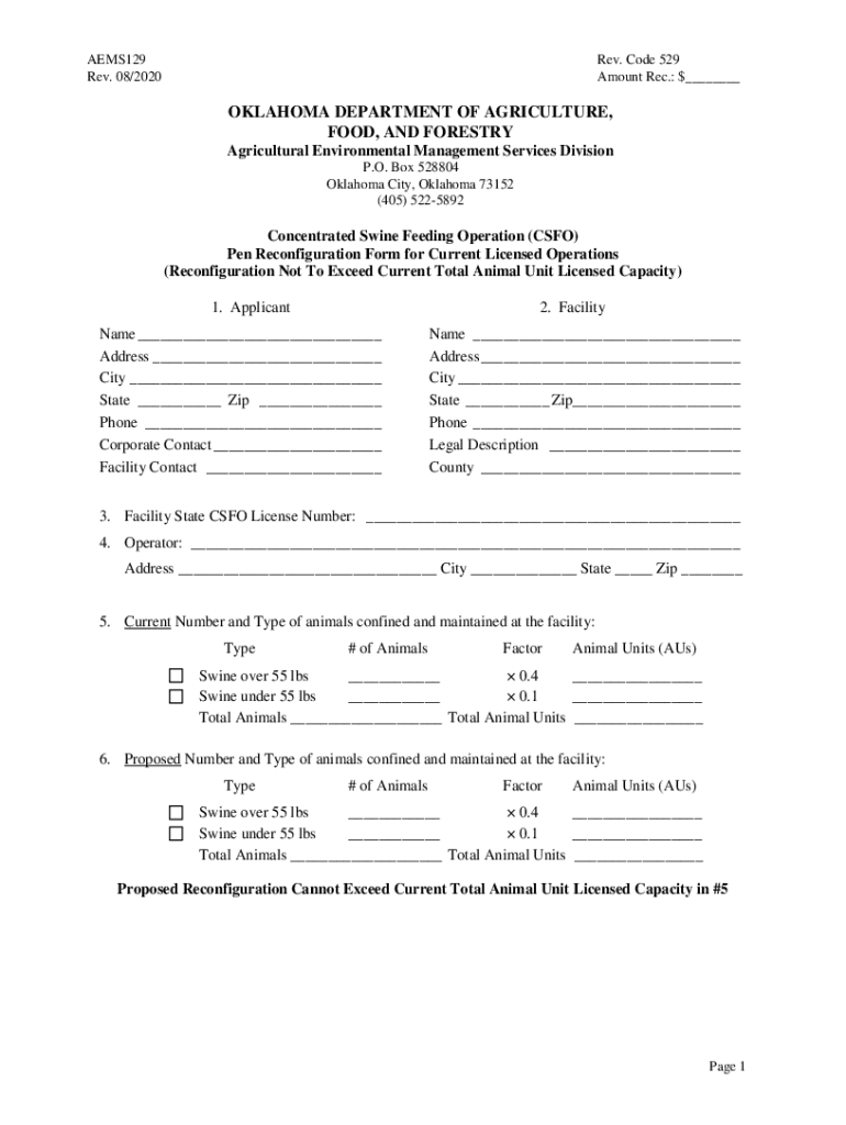 AEMS129 Rev. 08/2020Rev. Code 529 Amount Rec.: $ OKLAHOMA DEPARTMENT OF AGRICULTURE, FOOD, AND FORESTRY Agricultural Environmental Management Services Division P.O. Box 528804 Oklahoma City, Oklahoma