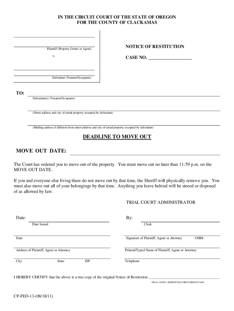 IN THE CIRCUIT COURT OF THE STATE OF OREGON FOR THE COUNTY OF CLACKAMASPlaintiff (Property Owner or Agent), v.NOTICE OF RESTITUTION CASE NO. Defendant (Tenants/Occupants).TO: Defendant(s) (Tenants/Occupants)(Street