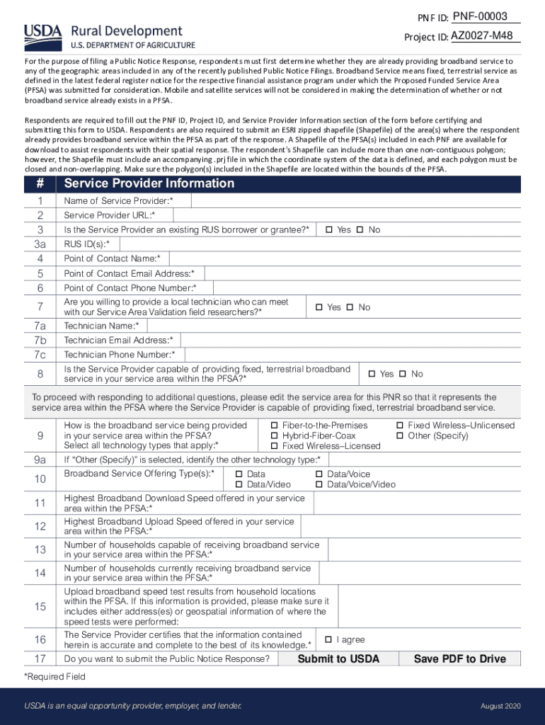 PNF00003 PNF ID: Project ID: AZ0027M48 For the purpose of filing a Public Notice Response, respondents must first determine whether they are already providing broadband service to any of the geographic