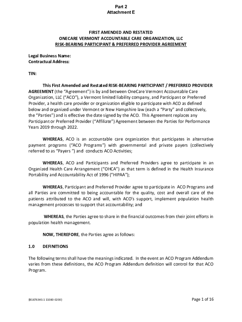 Part 2 Attachment FIRST AMENDED AND RESTATED ONE CARE VERMONT ACCOUNTABLE CARE ORGANIZATION, LLC MISHEARING PARTICIPANT & PREFERRED PROVIDER AGREEMENT Legal Business Name: Contractual Address: TIN: