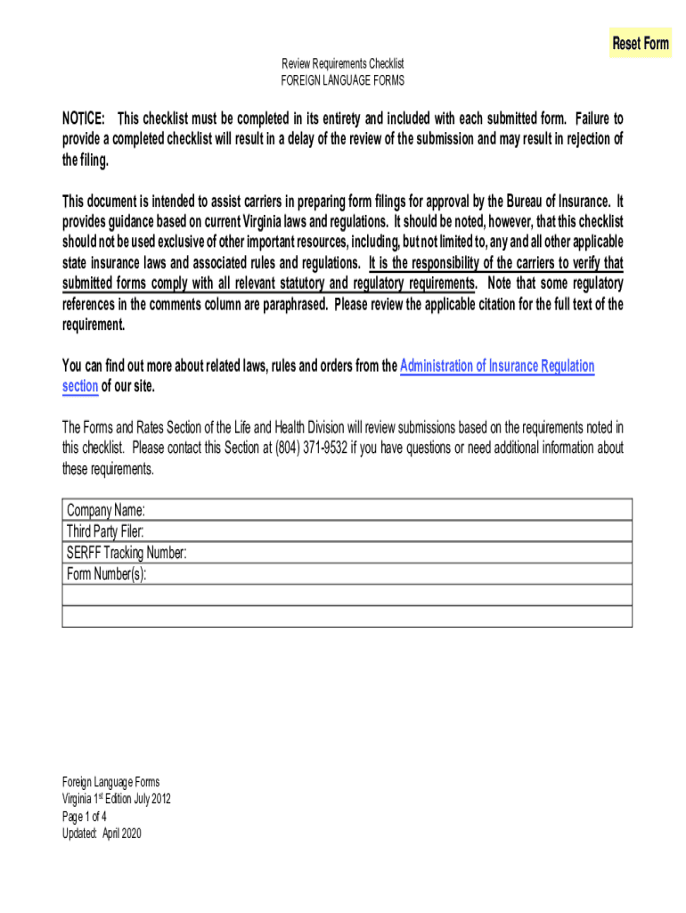 Review Requirements Checklist FOREIGN LANGUAGE FORMSPrintReset Formative: This checklist must be completed in its entirety and included with each submitted form. Failure to provide a completed checklist