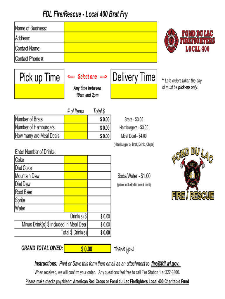 FDP Fire/Rescue Local 400 Brat Fry Name of Business: Address: Contact Name: Contact Phone #:Pick up Time Select one Delivery Timely time between 10am and 2pm# of Items Number of Brats Number of Hamburgers